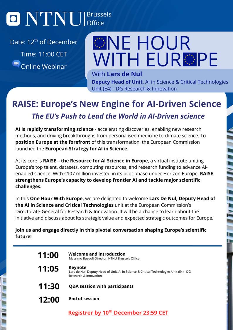 The NTNU Brussels Office is pleased to invite you to the upcoming - and last before the holidays - edition of our One Hour With Europe Webinar, featuring guest speaker Lars de Nul, Deputy Head of Unit, DG RTD, European Commission.